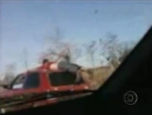Um homem foi flagrado deitado no teto de um carro a cerca de 80 quilômetros por hora na BR-497 entre Prata e Campina Verde, na Região do Triângulo Mineiro. Um cinegrafista amador, que estava emparelhado com o carro, enviou o vídeo e confirmou a velocidade do carro.