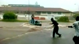 Imagens registradas pela câmera de um celular mostram moradores usando uma mangueira para salvar o motorista de um carro que estava preso no meio de uma enchente. O incidente aconteceu durante a forte chuva de terça-feira (18), em Matão, no interior de São Paulo.