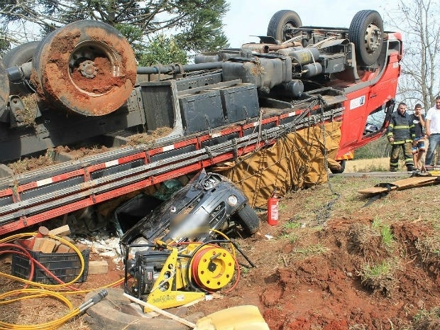 Um caminhão carregado de vasos sanitários tombou em cima de um carro, na PR-160, no trevo de acesso a Paulo Frontin, no sul do Paraná, na tarde de quinta-feira (8). Os quatro ocupantes do carro, todos da mesma família, e o motorista do caminhão sobreviveram ao acidente sem nenhum arranhão, segundo o Corpo de Bombeiros. “Foi um milagre”, conta o cabo Mario Malinowski, que ajudou no resgate das vítimas. O trabalho da equipe, segundo ele, durou cerca de uma hora