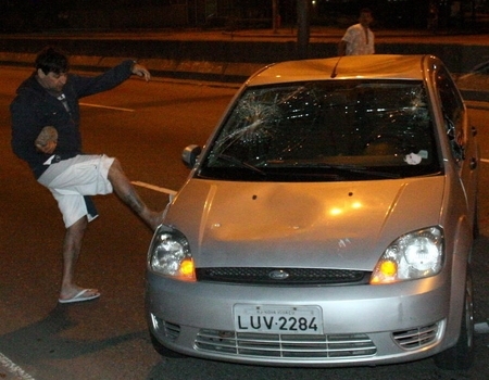 Revoltado ao ser informado que, por estar sem documentação, seu carro seria rebocado, o condutor pegou um pedregulho na rua, avançou na direção dos agentes da Operação Lei Seca e —pasmem — começou a lançar a pedra, seguidas vezes, no seu próprio carro, um Ford Fiesta.