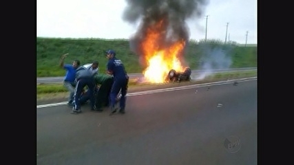 Imagens feitas por um cinegrafista amador registraram os momentos de desespero vividos por um grupo de pessoas tentando socorrer a vítima de um acidente na Rodovia Atílio Balbo (SP-333), em Ribeirão Preto (SP), neste domingo (27). O veículo capotou e explodiu após um dos pneus furar. O motorista conseguiu sair sozinho do carro, mas desmaiou logo em seguida. Ele foi levado para um hospital particular e não corre risco de morrer.