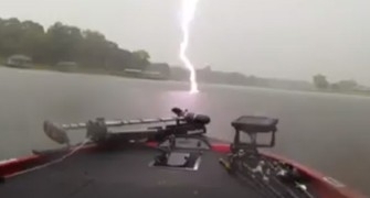 O jovem Tucker Owings, pescador profissional de apenas 16 anos, levou um grande susto enquanto pescava no lago Athens, no Texas (EUA), quando um raio caiu a poucos metros dele, em um momento assustador registrado por uma câmera colocada no barco.