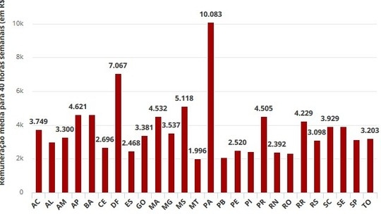 Na rede municipal, onde atua metade dos professores, a média de remuneração é de 4,3 salários mínimos. Na estadual, os professores recebem em média o equivalente a 4,8 salários. Já os professores da rede federal são os mais bem pagos do país: eles recebem em média R$ 48,55 por hora de trabalho, ou R$ 7.767,94 por mês. Neste caso, a remuneração sobe para 10,7 salários mínimos, o triplo do valor pago na rede privada. As vagas de docentes na rede federal, porém, representam apenas 1% dos professores do país. Atualmente, o salário mínimo equivale a R$ 937, mas, em 2014, ele valia R$ 724.
