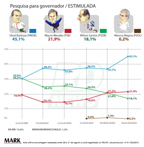 Silval Barbosa subiu 7 pontos percentuais num intervalo de 20 dias na corrida à sucessão estadual e chega aos 45,1% das intenções de voto a menos de 30 dias das eleições gerais. Na amostragem feita no início de agosto, o peemedebista aparecia com 37,7%. Agora, nesta sexta rodada da pesquisa Mark com abrangência estadual, realizada em parceria com o RDNews, o nome do governador figura com 45,1%.