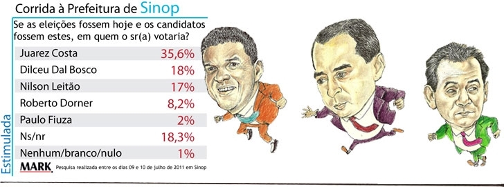 O prefeito de Sinop, Juarez Costa (PMDB), conquistaria hoje a reeleição com ampla vantagem. É o que aponta uma nova dada da pesquisa Mark, feita em parceria com o RDNews nos últimos dias 9 e 10. Numa simulação com cinco possíveis candidatos à sucessão municipal, Juarez aparece com 35,6% das intenções de voto.