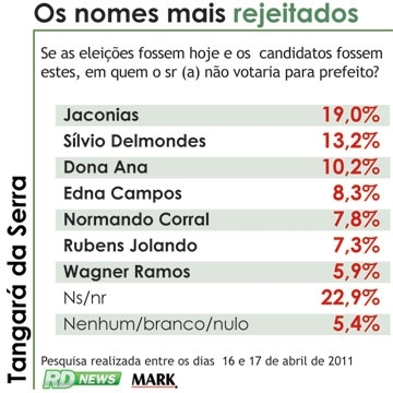 O vice-prefeito de Tangará da Serra, José Jaconias (PT), é o mais rejeitado dentre os virtuais candidatos à sucessão de Júlio César Ladeia (PR). Dos entrevistados pelo instituto Mark, 19% disseram que não votariam de jeito nenhum no petista. A margem de erro da pesquisa é de 5% para mais ou para menos.