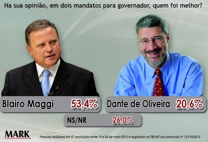 Blairo Maggi foi melhor governador do que Dante de Oliveira. É o que aponta pesquisa do instituto Mark, realizada em 51 municípios. Dos entrevistados, 53,4% disseram considerar que Maggi se destacou mais como gestor, enquanto 20,6% entendem que Dante, que faleceu em 2006, foi melhor.