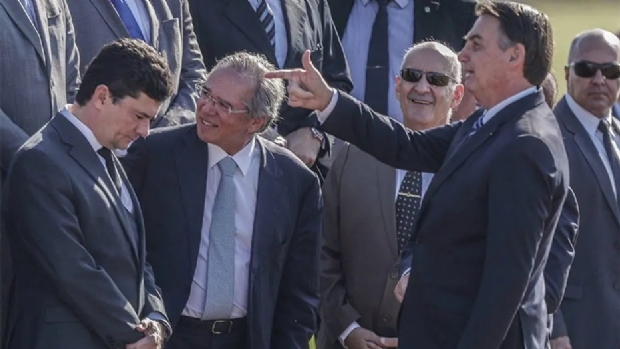 Na imagem, Bolsonaro aparece rindo e fazendo sua tradicional pose de arma com as mãos, enquanto Moro, cabisbaixo, é “fuzilado” pelo presidente.