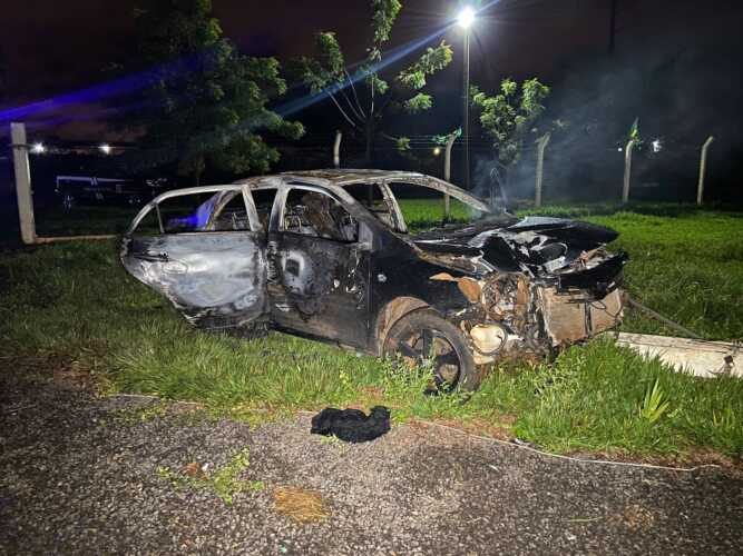 Tangará: Criminoso rouba fazenda e foge em Corolla, dispara contra PM e acaba preso. Carro pega fogo
