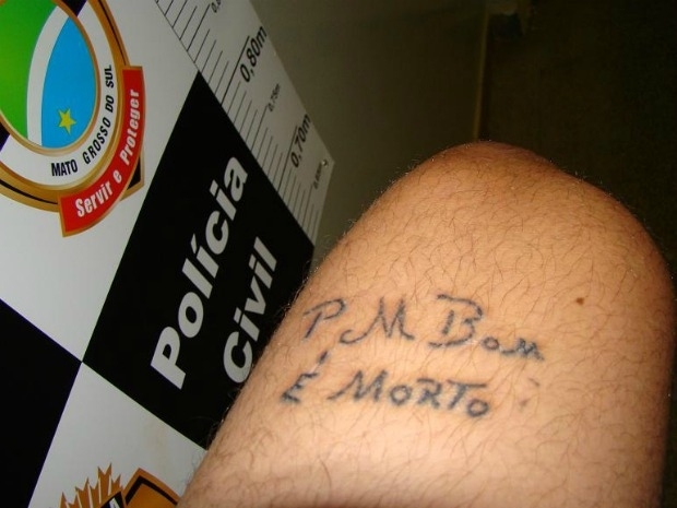 "PM bom é morto", a mensagem em tom agressivo está tatuada na perna de um adolescente de 16 anos, que foi apreendido nesta terça-feira (8), em Aparecida do Taboado, a 467 quilômetros de Campo Grande, porque, segundo a Polícia Civil, ele é suspeito de participar de um roubo seguido de morte (latrocínio), em uma boate da cidade, no dia 30 de outubro deste ano.