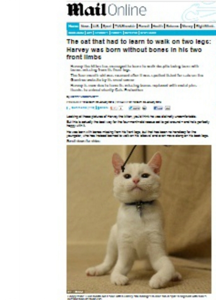 Harvey não é um gato comum. Aos quatros meses de vida, o filhote anda e corre apoiando os cotovelos no chão. Isso porque o animal nasceu sem os ossos das patas dianteiras