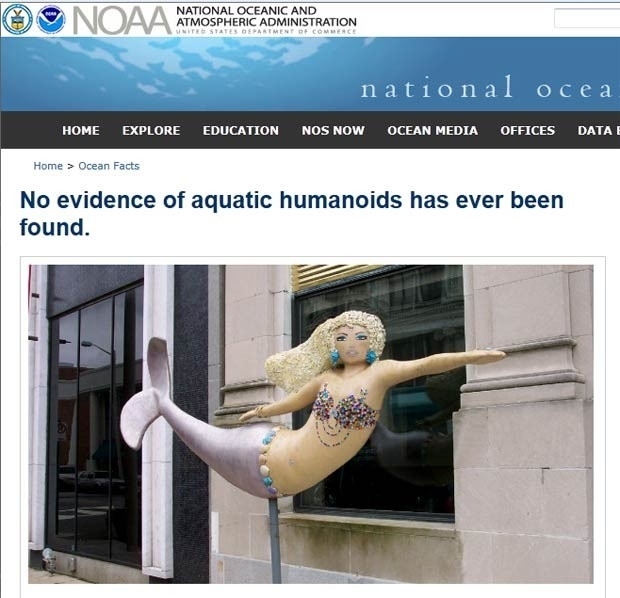 A agência do governo dos EUA que estuda os oceanos e a atmosfera emitiu um comunicado aparentemente negando a existência de sereias, segundo o site "Slate".