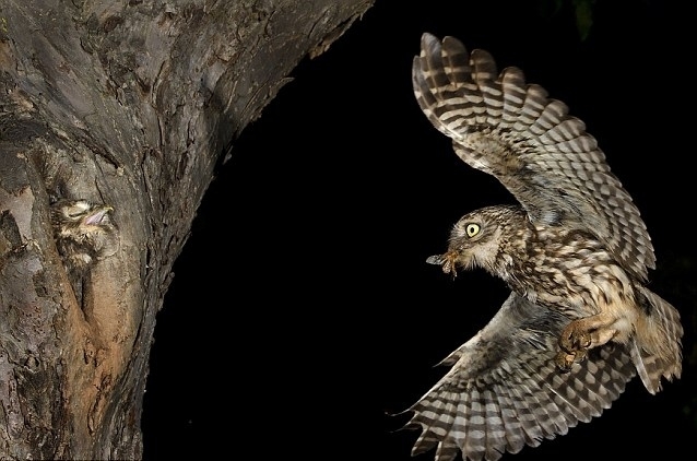 Fotógrafo flagra momento em que mamãe coruja chega com alimentos de bebês