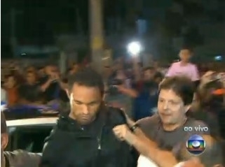 O goleiro Bruno e seu amigo Luiz Henrique Ferreira Romão, conhecido como Macarrão, acabam de deixar a Polinter do Andaraí a caminho da Divisão de Homicidos, na Zona Oeste do Rio. Mais cedo, eles haviam se entregado à polícia. O jornal "Extra" acompanhou a chegada de Bruno na Polinter. Houve grande tumulto na saída dos carros que levavam os dois. Pessoas batiam em carros e gritavam "assassino". Eles foram acompanhados de três advogados.