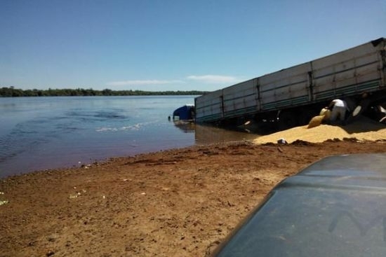 MT: Carreta carregada com milho cai dentro do rio Xingú
