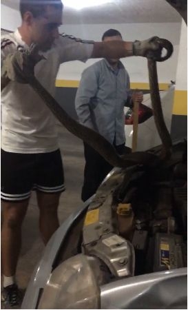 Uma cobra sucuri de aproximadamente dois metros foi encontrada presa dentro de um carro por volta das 12 horas desta segunda-feira, na garagem do edifício Ópera Prima, no bairro Santa Rosa, em Cuiabá.