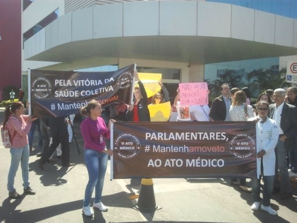 Profissionais da enfermagem, educação física, psicologia e outras 10 áreas da saúde, realizaram protesto em frente da Assembleia Legislativa na manhã desta quinta-feira (15) pela manutenção do veto da presidente Dilma Rousseff (PT), que dispõe sobre o exercício da medicina, o chamado Ato Médico, cujos itens restringem aos médicos funções como a de aplicar injeções, indicar o uso de órteses e próteses e fazer diagnóstico de doenças