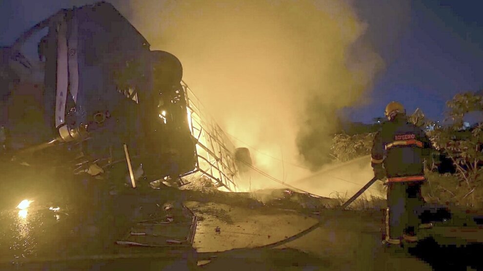 Ônibus bate em poste, tomba e pega fogo em rodovia de Mato Grosso