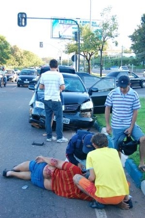 Um motoqueiro ficou gravemente ferido após um acidente ocorrido no final da tarde de hoje na Avenida Historiador Rubens de Mendonça, em Cuiabá. Testemunhas afirmam que Maurício Luiz de Almeida furou o semáforo e acabou acertando a lateral de um Corolla preto.