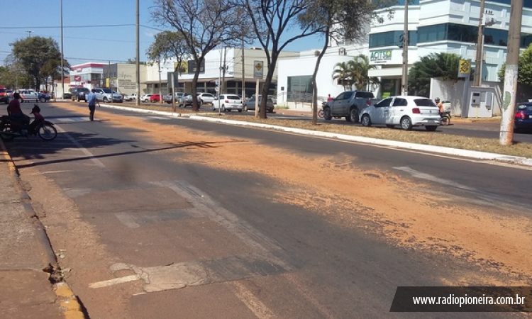 Na manhã desta terça-feira (08), parte da Avenida Tancredo Neves de Tangará da Serra, em frente ao INSS e próximo à rotatória central, ficou interditada após um caminhão derramar óleo diesel na pista.