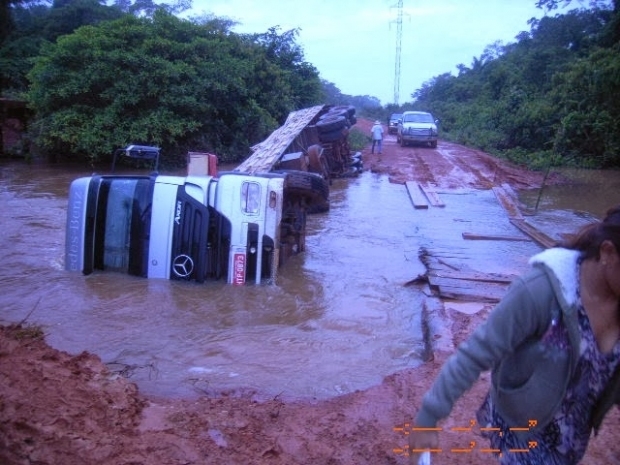 Na madrugada de ontem, uma carreta (marca/modelo não informados) carregada com cimento caiu de uma ponte localizada em um desvio no km 15 da MT-205, no trecho entre Alta Floresta e Nova Monte Verde