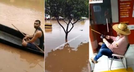 Moradores andam de barco e 'pescam' em ruas alagadas após chuva em Nobres (MT)