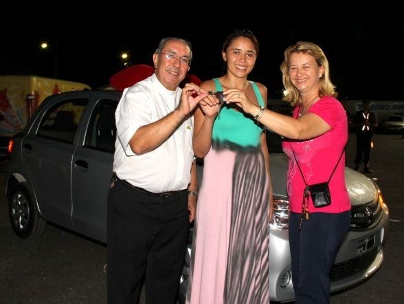 Angélica Ferreira Magalhães, 25, moradora do bairro Bela Vista, em Cuiabá, foi a premiada com o carro Ethios 2013, da Toyota. O veículo foi sorteado no encerramento da 27ª edição do Vinde e Vede, realizado no Memorial Papa João Paulo II, de 09 a 12 de fevereiro. A jovem é auxiliar de cozinha do Sesc Arsenal, participa da comunidade Santa Luzia, no bairro onde mora, e esteve em todos os dias em um dos maiores encontros de carnaval católico do país. A cartela premiada foi adquirida no último dia do encontro, poucas horas do início do sorteio