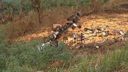 Motorista perde controle da direção e carreta cai em ribanceira em Tangará da Serra