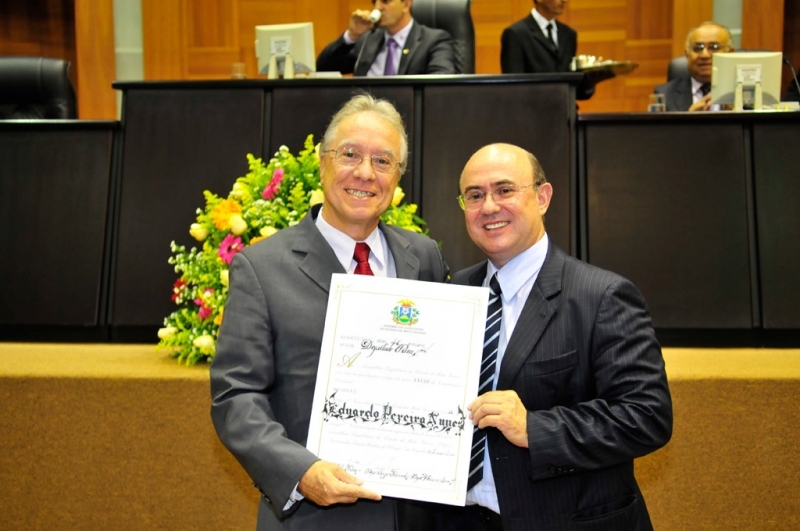 Em reconhecimento ao grandioso trabalho prestado pelo presidente do Instituto Brasileiro de Geografia e Estatística (IBGE), desde 1980, Eduardo Pereira Nunes recebeu o Título de Cidadão Mato-grossense nesta segunda-feira (30), durante sessão solene em comemoração aos 75 anos de criação do IBGE. De autoria do presidente da Assembleia Legislativa, deputado José Riva (PP), a solenidade também foi marcada pela entrega de 173 Moções de Congratulação aos empreendedores da instituição.