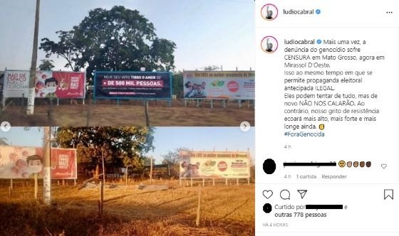 O outdoor instalado em Mirassol D’Oeste (a 300 km de Cuiabá) com críticas ao presidente Jair Bolsonaro foi derrubado. O deputado estadual Lúdio Cabral (PT) postou nas redes sociais fotos do material publicitário no chão e classificou a ação como censura.