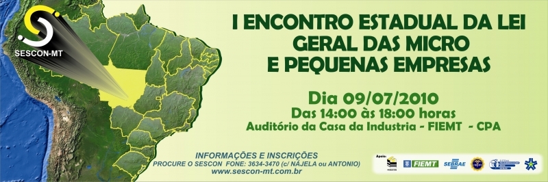 A Lei Geral das Micro e Pequenas Empresas e suas implicações para a economia, no âmbito dos Estados e Municípios, irá a debate no próximo dia 9, no horário das 14 às 18 horas, durante um evento a ser realizado no auditório da Federação das Indústrias no Estado de Mato Grosso (Fiemt). O I Encontro Estadual da Lei Geral das Micro e Pequenas Empresas será promovido pela Federação Nacional de Contabilidade, Sindicato das Empresas de Serviços Contáveis e das Empresas de Assessoramento (Sescon), Serviço Brasileiro de Apoio à Pequena e Média Empresas (Sebrae) e Conselho Regional de Contabilidade (CRC).