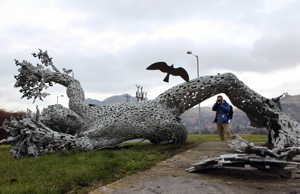 Homem fotografa escultura gigante que caiu após ter sido atropelada por um carro na rotatória Muirside, na cidade escocesa de Tullibody, nesta terça-feira (15).