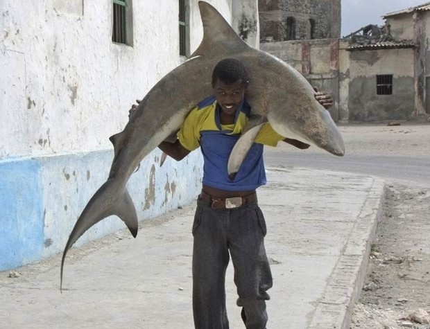 Pescador é flagrado levando tubarão nos ombros em rua na Somália