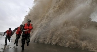 Guardas fogem de onda gigante antes da chegada do tufão Fitow na China