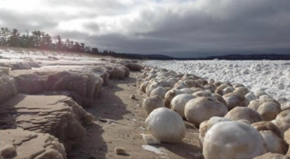 Americana sai para passear com cão e encontra praia tomada por bolas gigantes formadas de gelo