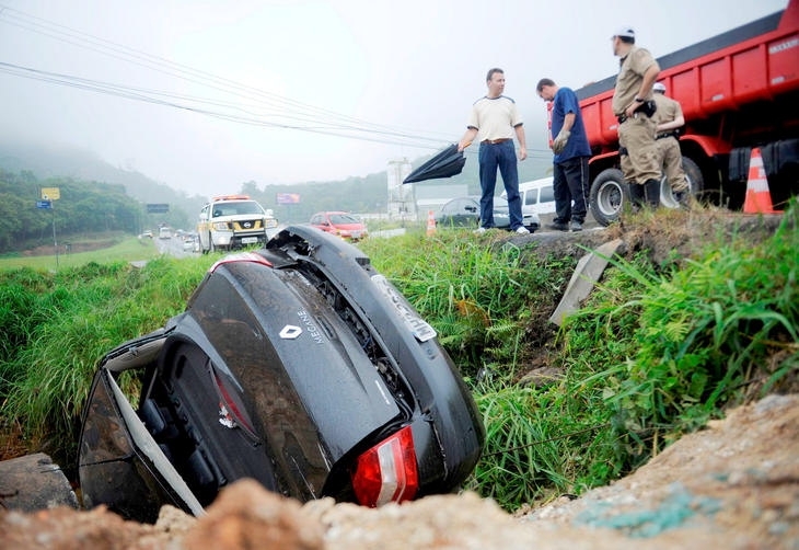 Um Renault Megané caiu em uma vala, próximo a entrada do bairro Cacupé, em Florianópolis, no início da tarde desta sexta-feira. A mulher que dirigia o carro fraturou o nariz e foi encaminhada para o Hospital Celso Ramos